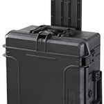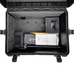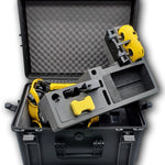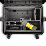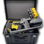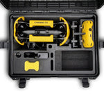 - Il trolley con schiuma ha 2 livelli. Nel livello superiore, tutte le cose importanti sono direttamente accessibili (telecomando, drone, cavo, ecc.) e nel secondo livello, il cavo incluso il tamburo e il braccio della pinza. La valigia è stata prodotta da noi in Germania e ha le seguenti dimensioni: 604x473x283mm e un peso a vuoto di circa 8Kg.