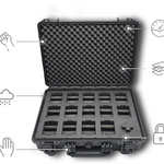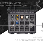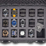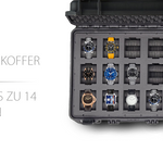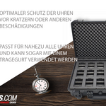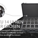 Custodia da trasporto estremamente sicura per un massimo di 14 orologi. Progettato in modo tale che quasi tutte le dimensioni delle sveglie possano entrare nella custodia. La custodia è certificata IP67, quindi (sotto)impermeabile - antipolvere. I vostri orologi sono così conservati in modo sicuro in tutti gli ambienti. Gli orologi sono posizionati su cuscinetti di schiuma flessibile, in modo che anche gli orologi con cinturini piccoli si adattino perfettamente.