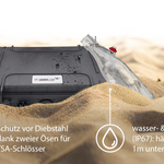 Con fori per chiudere con un lucchetto e attaccare una cinghia di trasporto (a sinistra e a destra sulla serratura)