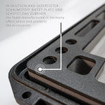 L'interno della custodia è fatto di schiuma speciale modellata di alta qualità, robusta e durevole; ideale per elementi delicati e in filigrana, così come per i componenti elettrici. Il contenuto è resistente all'acqua e alla polvere. La cassa è fabbricata in Germania sotto rigorose norme ambientali e sanitarie del
